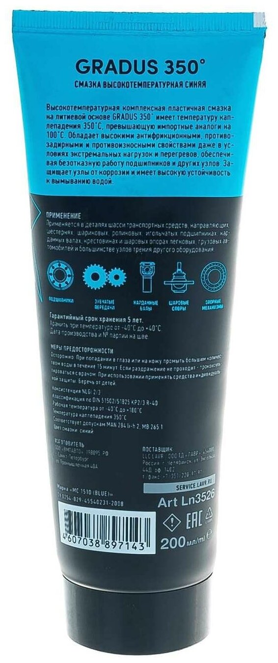 Ln3526_смазка Подшипниковая! Высокотемп. +350град, Синяя, Gradus 350 - Lavr Service, Тюбик 200мл LAVR арт. LN3526 1 344 ₽