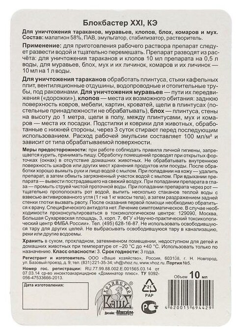 Жидкость Ваше хозяйство Блокбастер XXI концентрат от бытовых насекомых, 10 мл информация: