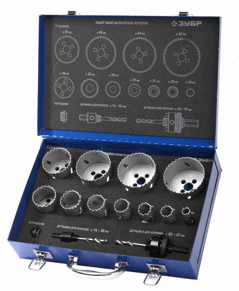 Зубр Набор "эксперт": Коронки биметаллические, глубина сверления до 38мм, d 14,20,22,25,30,35,40,51,60,64,67мм 29531-H11