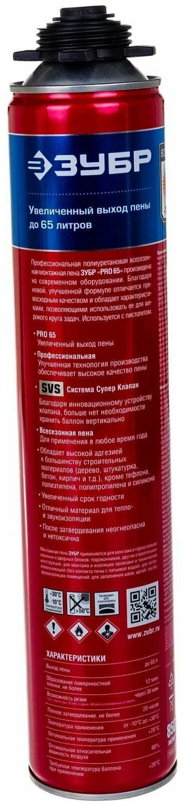 Монтажная пена ЗУБР Pro 65 41147_z01 850 мл всесезонная информация: