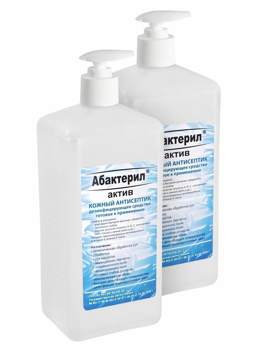2 шт. Кожный антисептик с вирулицидной активностью ГОСТ 12.1.007-76 Абактерил-Актив с насос-дозатором 1 л.