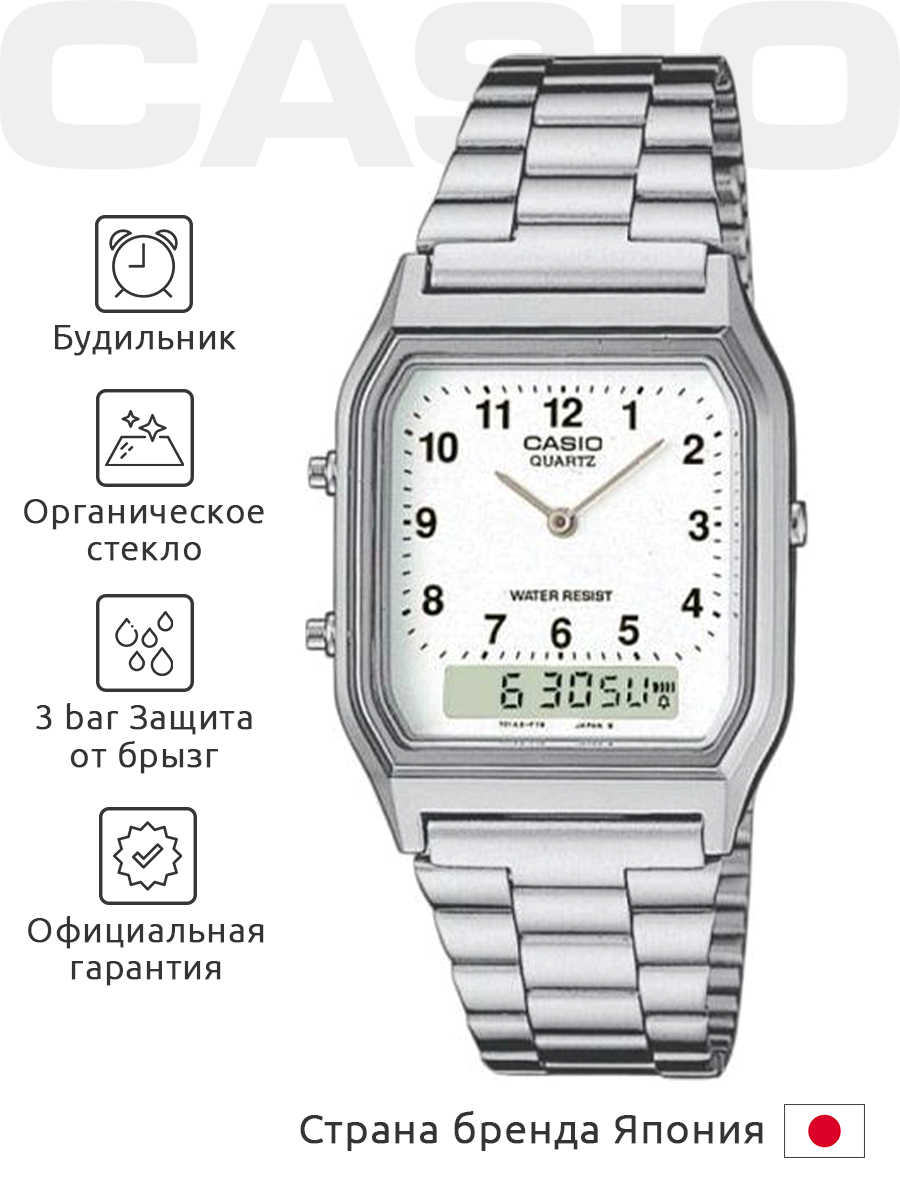 AQ-230A-7A Casio наручные часы кварцевые WR30 (3 атм) мужские, женские серебряный секундомер будильник отображение числа, второй часовой пояс, отображение дня недели, отображение месяца бесшумный механизм акриловое стекло 5 572 ₽