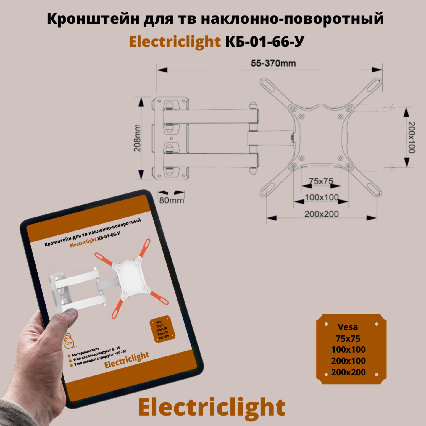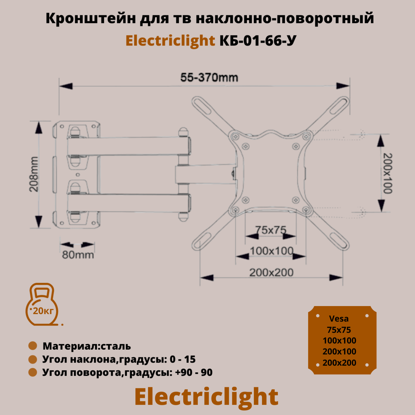 Кронштейн для телевизора на стену наклонно-поворотный с диагональю 13"-42" Electriclight КБ-01-66-У,белый информация: