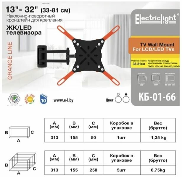 Кронштейн для телевизора на стену наклонно-поворотный с диагональю 13"-32" Electriclight КБ-01-66,черный