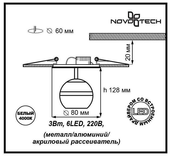 Светильник встраиваемый светодиодный белый 8 Вт 4000К IP20 Rev ДВО (28944 9)