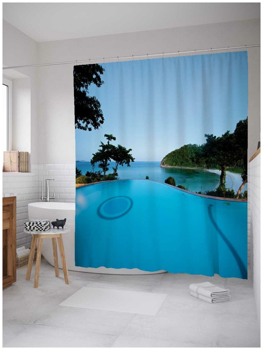 Отзывы на Штора (занавеска) для ванной JoyArty "Бассейн впадает в море" из сатена, 180х200 см с крючками