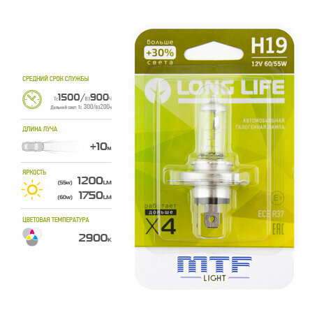 Галогенная лампа MTF Light автомобильная H19 12V 60/55W LONG LIFE x4 блистер информация: