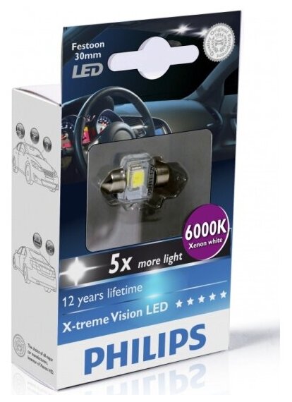 Лампа Philips X-treme, ультратонкая, C5W, 30 мм, Festoon, 6000K, Ярко-белая, внутренняя подсветка, подсветка номерного знака 129416000KX1 1 691 ₽