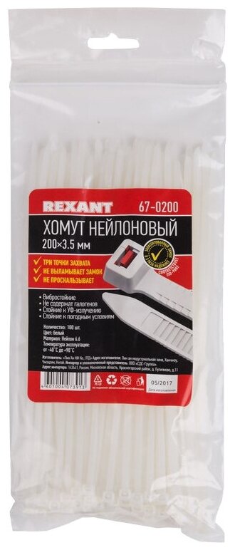 Хомут-стяжка с тройным замком Rexant, нейлон, 3,6 x 200 мм, 100 шт, белый информация: