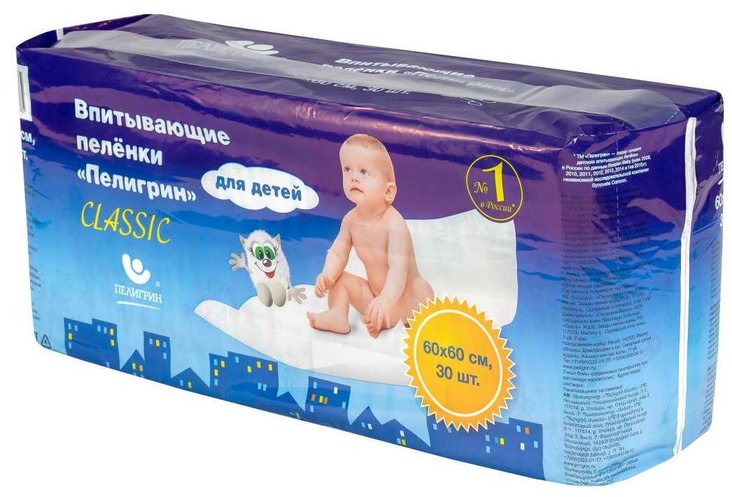 10 цен на Пеленки-простыни впитывающие 60х60 см, пелигрин "Classic", комплект 30 шт., 5 слоев, одноразовые