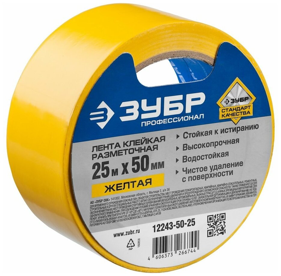 ЗУБР Разметочная клейкая лента, ЗУБР Профессионал 12243-50-25, цвет желтый, 50мм х 25м