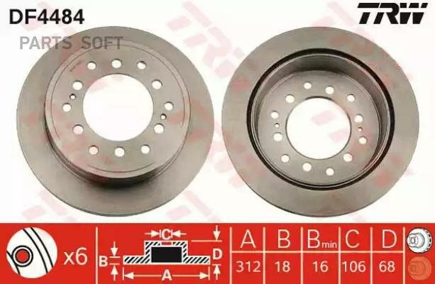 Диск тормозной задн TOYOTA: LAND CRUISER 03-, LAND CRUISER 93-96, LAND CRUISER 90 95-, LAND CRUISER HARDTOP 93-96 (упаковка 2 шт.), TRW DF4484