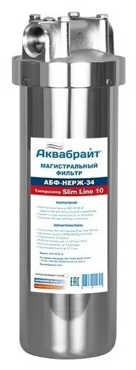 Магистральный фильтр Аквабрайт АБФ-НЕРЖ-34, Slim Line 10", 1/2"