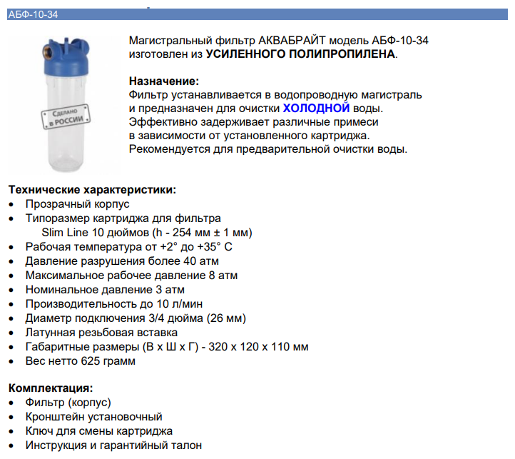 Магистральный фильтр аквабрайт для холодной воды АБФ-10-34 (+Кронштейн установочный Ключ для смены картриджа Инструкция и гарантийный талон)