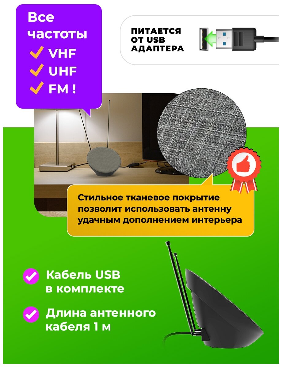Антенна RITMIX RTA-180 AV, комнатная, активная, Конструкция антенны: Телескопическая поворотная, Длина телескопической антенны До 60 см, Коэффициент