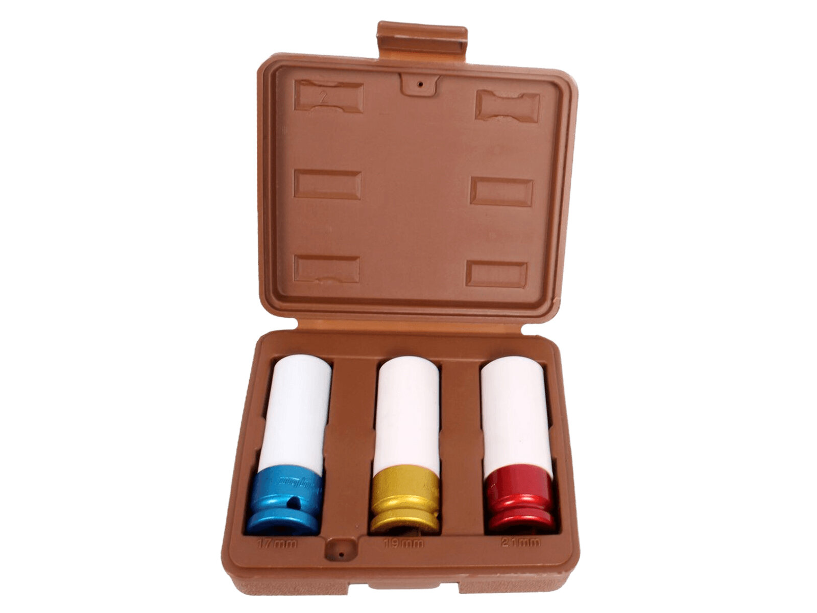| Подробная комплектация | Набор головок торцевых глубоких для ударного инструмента 1/2"DR, для лекгосплавных колесных дисков, 17,19,21 мм, 3 предмета Ombra |