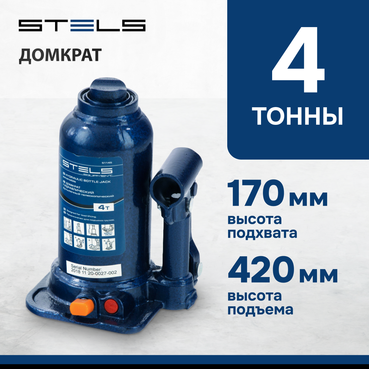 Домкрат гидравлический бутылочный Stels Equipment STELS 4 т, подъем 170-420 мм, 51145