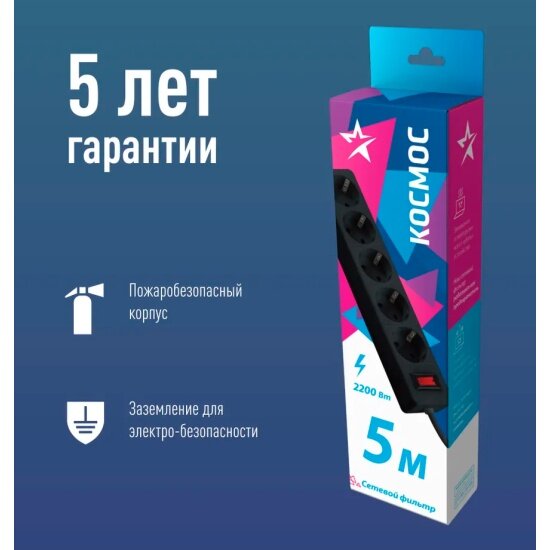 Сетевой фильтр Космос Электро Космос 5х5м с заземл. 10А IP20 2.2кВт 3х0.75 индик. сети, черный, FKsm5m-5g(B) информация: