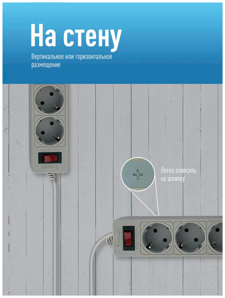 Сетевой фильтр Космос 3 м 5 розеток пвс 3х0 75мм2 серый информация: