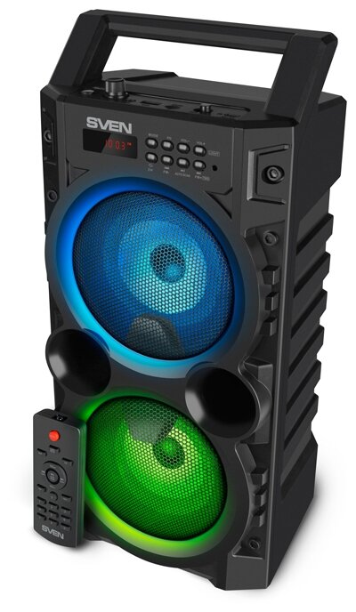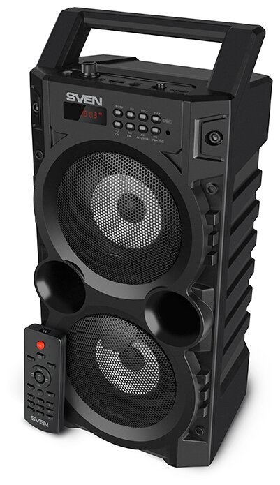 Sven PS-440 2.0 чёрные Мобильные колонки (2x10W, USB, Bluetooth, micro SD, FM-радио, LED-подсветка, LED-дисплей, ручка, ПДУ, 2 х 2000 мA )