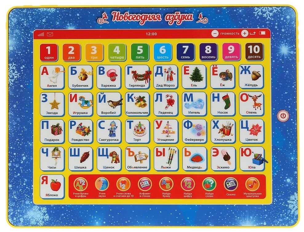 Музыкальный планшет УМка Новогодняя Азбука сенсорный, 34 стиха и сказки, 9 режимов работы