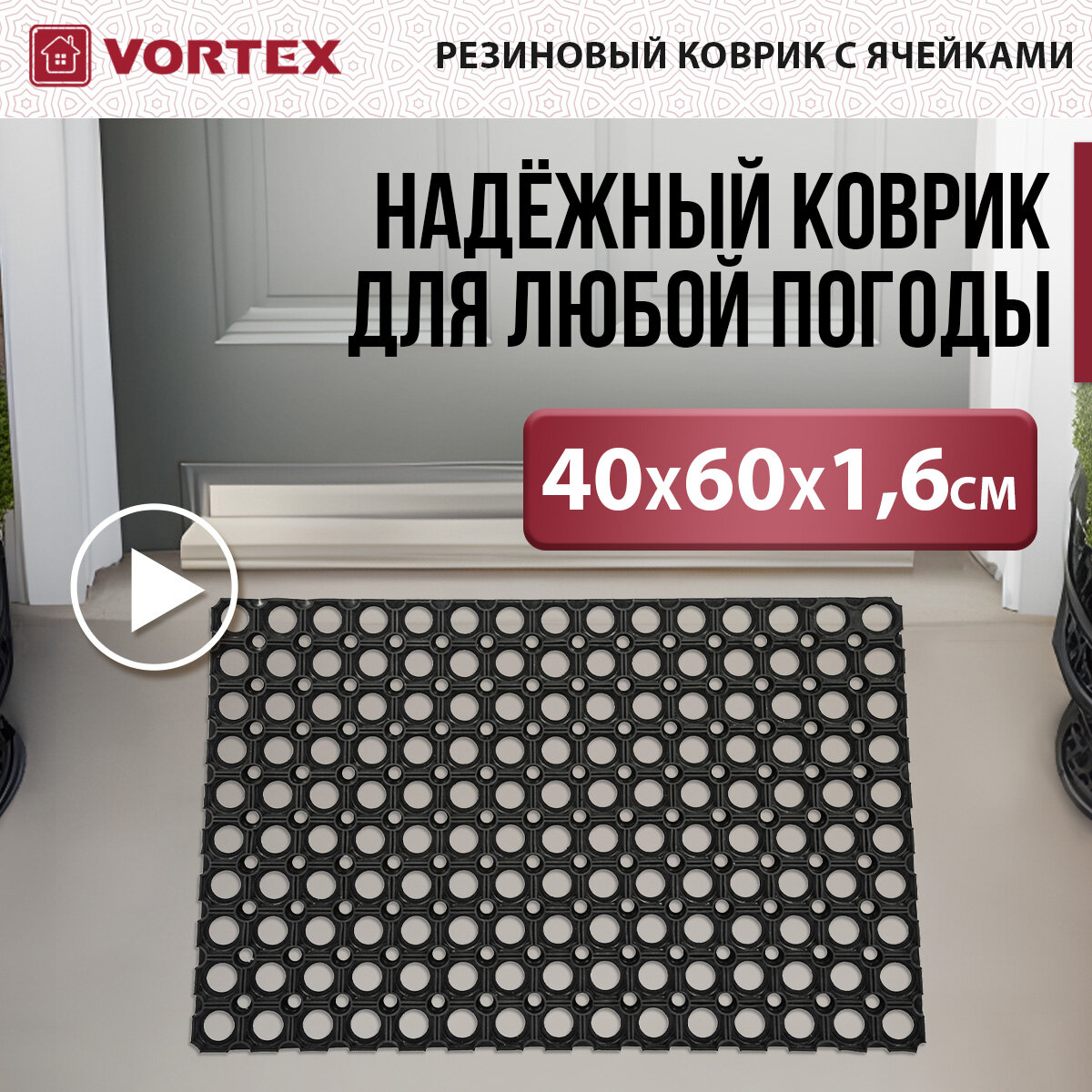 Коврик входной Vortex резиновый крупноячеистый грязезащитный, 50х100 см, толщина 16 мм, черный