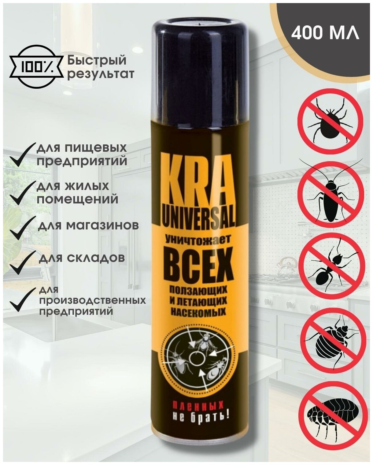 Аэрозоль Ваше хозяйство KRA-universal уничтожает всех ползающих и летающих насекомых