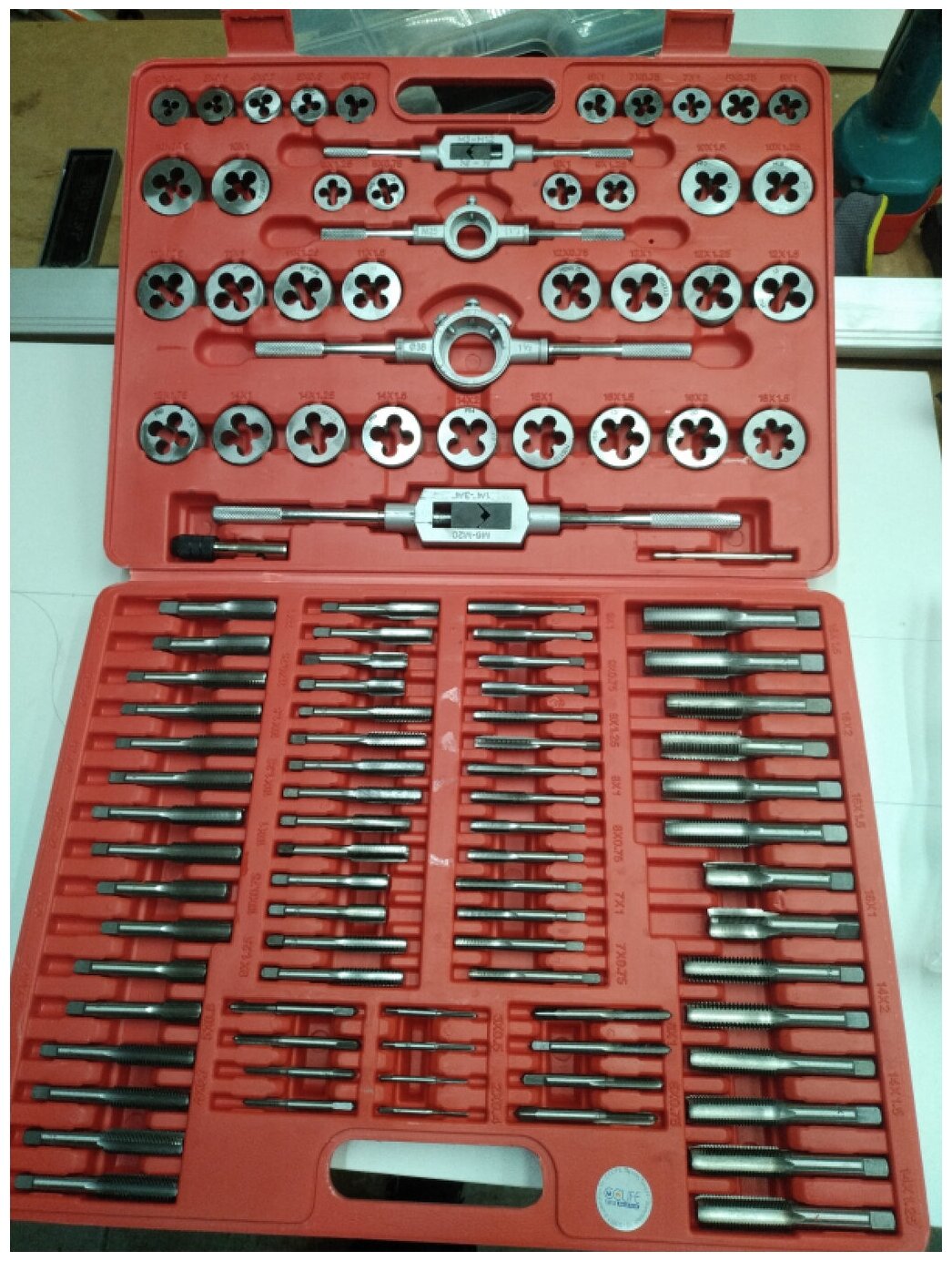 | Подробная комплектация | - 20 метчиков: M6x0.75, M6x1.0, M8x1.0, M8x1.25, M10x1.25, M10x1.5, M12x1.25, M12x1.5, M14x1.5, M14x2.0, M16x1.5, M16x2.0, M18x1.5, M18x2.5, M20x1.5, M20x2.5, M22x1.5, M22x2.5, M24x1.5, M24x3.0; - 14 плашек ⌀1-1/2": M6x0.75, M6x1.0, M8x1.0, M8x1.25, M10x1.25, M10x1.5, M12x1.25, M12x1.5, M14x1.5, M14x2.0, M16x1.5, M16x3.0, M18x1.5, M18x2.5; - 6 плашек ⌀2": M20x1.5, M20x2.5, M22x1.5, M22x2.5, M24x1.5, M24x3.0; - 5 экстракторов (№№ 1-5); - кернер; - ключ для метчиков Т-образный; - метчикодержатель; - плашкодеражатель; - адаптер; - отвертка; - кейс. |