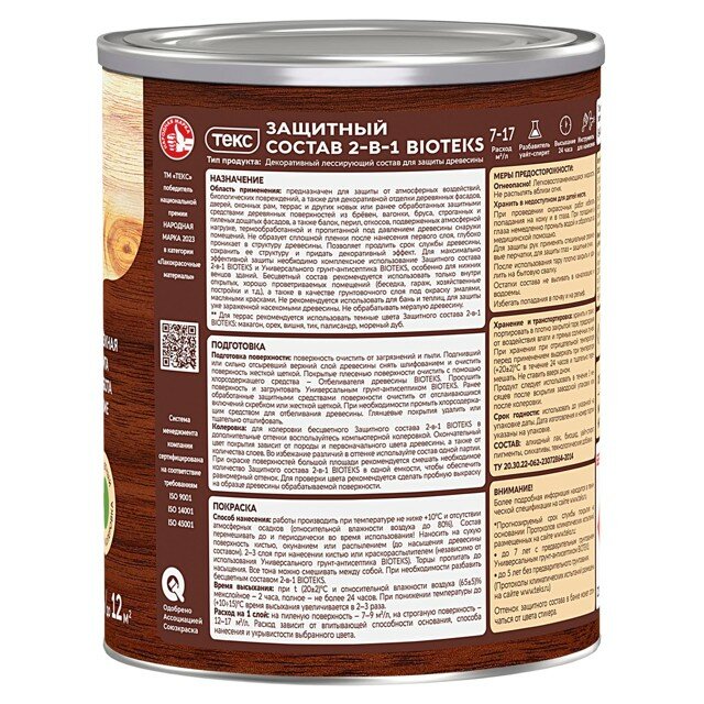 Защитный Состав 2-в-1 Текс Bioteks 0.8л Орех, не Требует Предварительного Грунтования для Наружных Работ / Текс Биотекс. 495 ₽