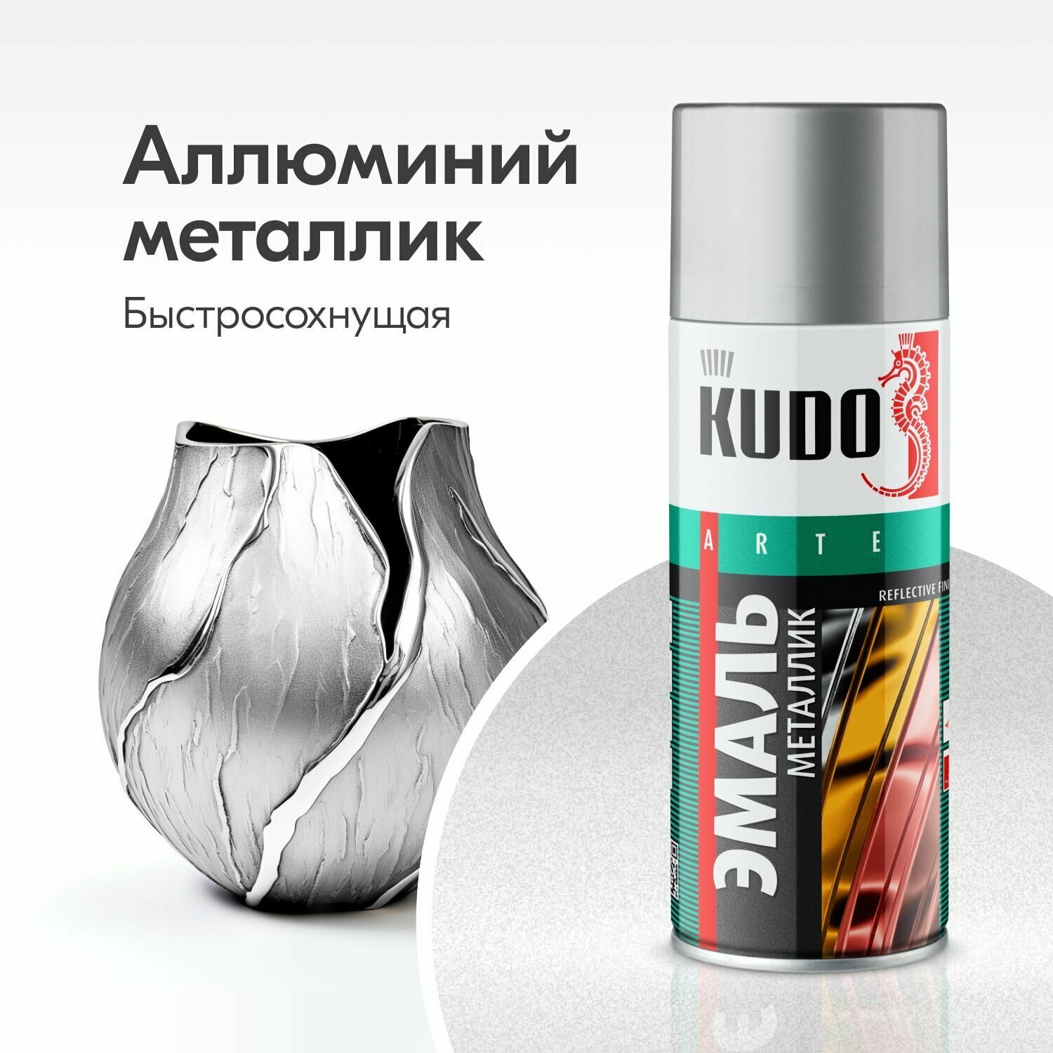 Эмаль KUDO универсальная металлик Reflective finish, алюминий, глянцевая, 520 мл, 12 шт.