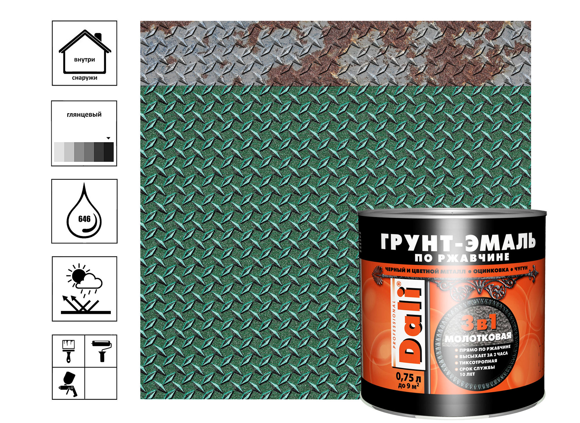 Грунт-эмаль по ржавчине 3в1 молотковая DALI (зеленый / 0.75л.) информация: