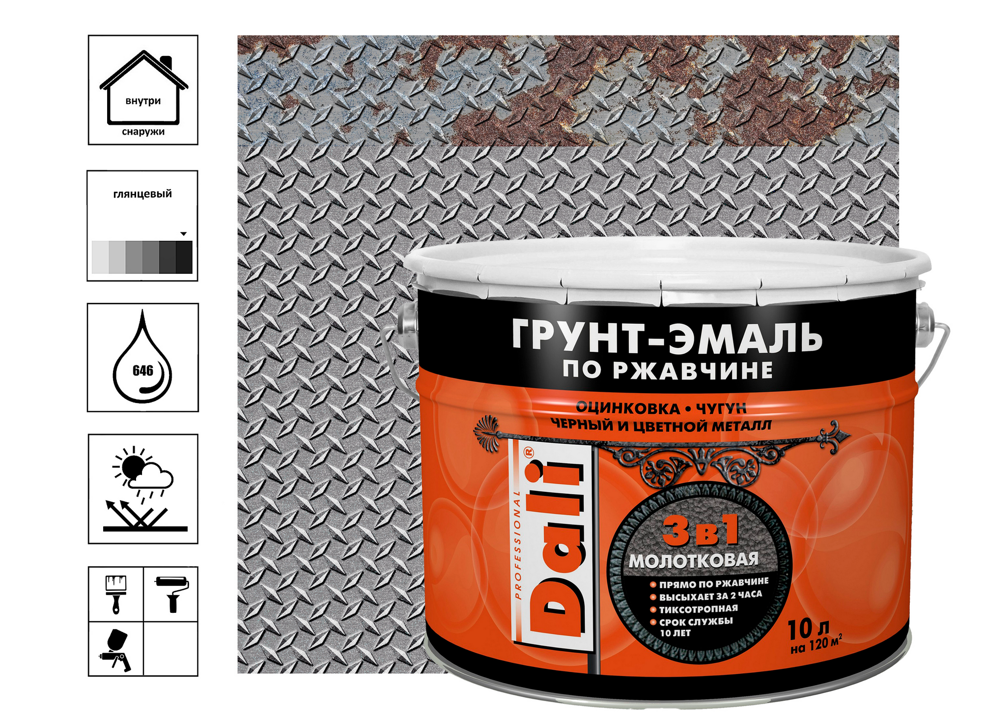 Dali / Дали Грунт-эмаль по ржавчине 3 в 1 молотковая алкидная серая 10л