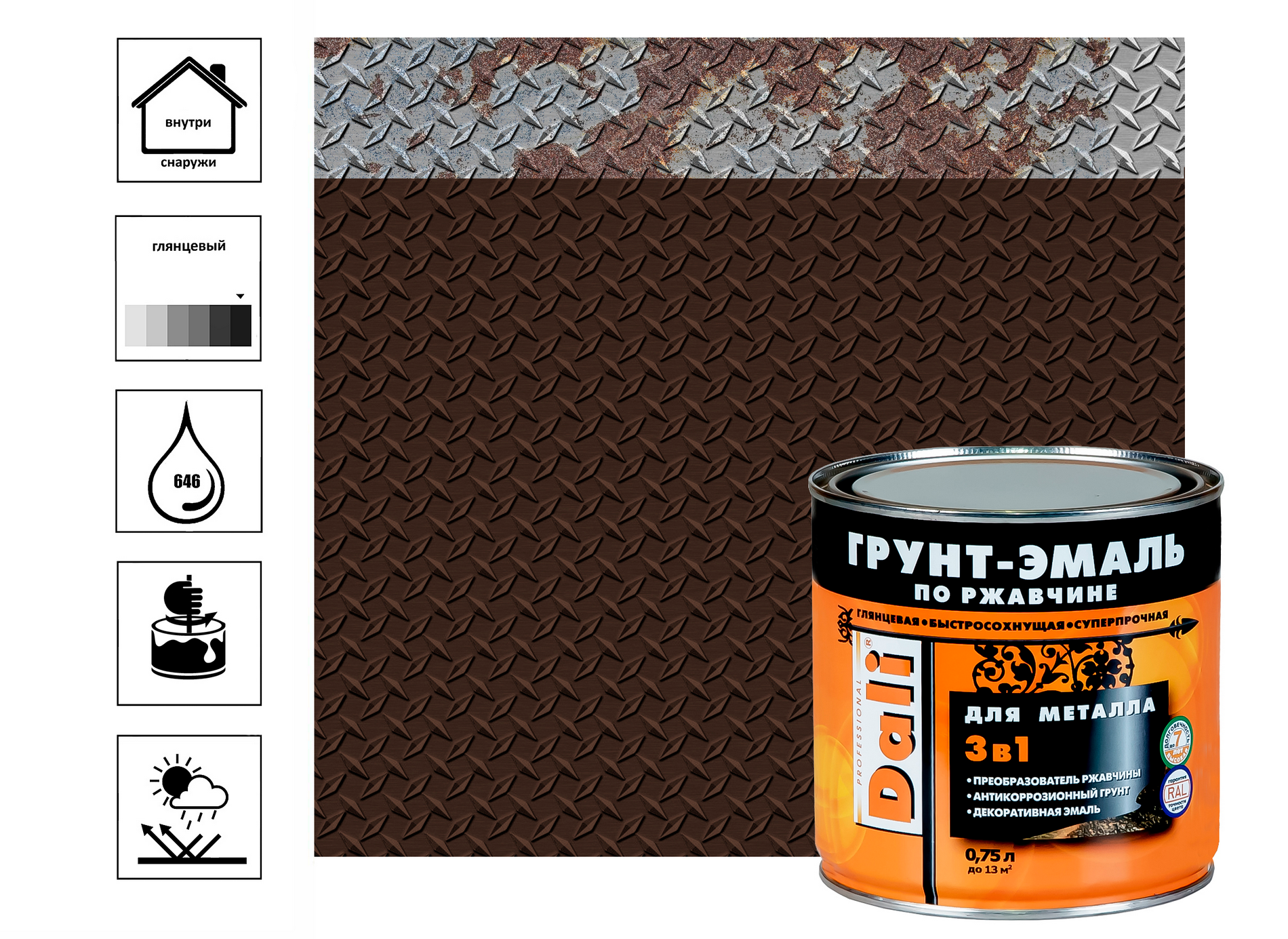 Грунт-эмаль по ржавчине 3в1 гладкая DALI (RAL 8017 - коричневый / 0.75л.) информация: