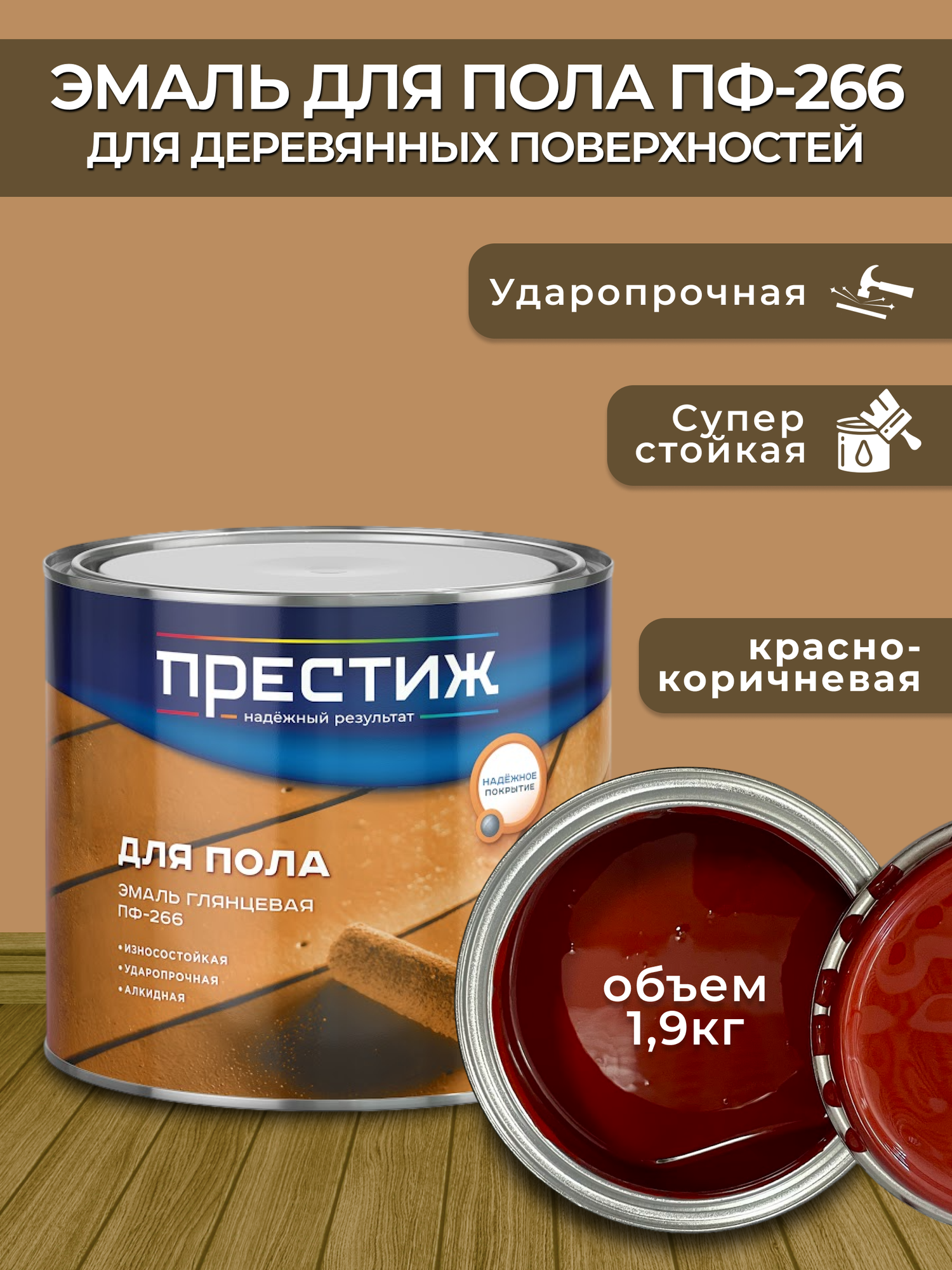 Эмаль ПФ-266 для пола Престиж, алкидная, глянцевая, 1,9 кг, золотисто-коричневая, 1шт, металлическая банка