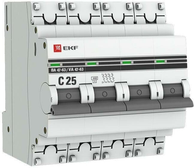 Модульный автоматический выключатель ВА 47-63 PROxima 4 полюса, 25А, х-ка C | код. mcb4763-4-25C-pro | EKF ( 1шт. ) 1 320 ₽