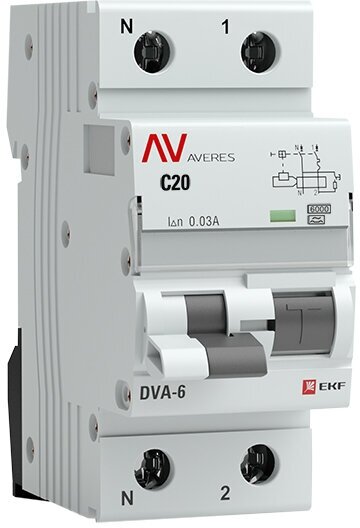 Выключатель автоматический дифференциального тока 2п C 20А 30мА тип A 6кА DVA-6 Averes, EKF RCBO6-1PN-20C-30-A-AV (1 шт.)