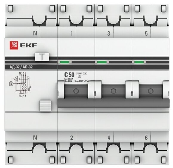 DA32-50-30-4P-pro Дифференциальный автоматический выключатель EKF АД-32 PROxima 3П+N 50А 30мА, тип AC, 4.5кА, C информация: