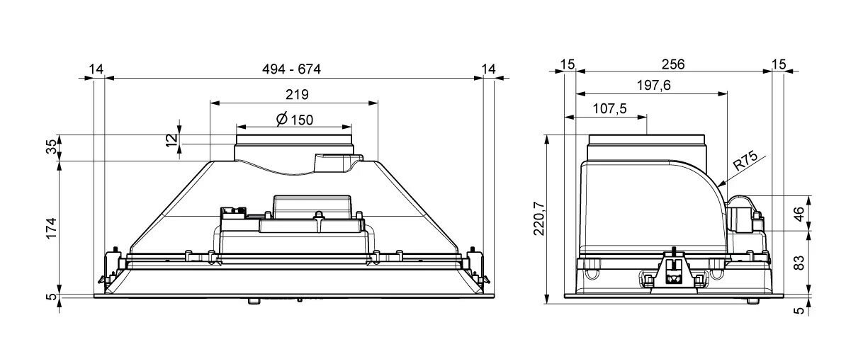 | Дополнительная информация | двойной вывод воздуховода (диаметр): 120/150 мм; количество ламп освещения: 2; мощность каждой лампы: 1 Вт |