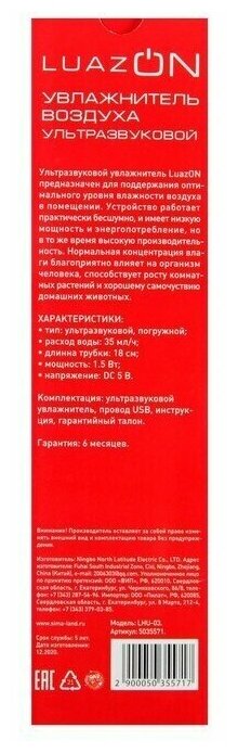 Luazon Home Увлажнитель воздуха Luazon LHU-03, ультразвуковой, портативный, погружной, USB, белый информация: