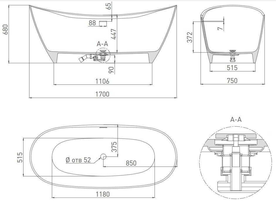 Salini Ванна Noemi 170 х 75 х 68 см, из искусственного камня S-Stone, белый матовый, 101722M 292 118 ₽