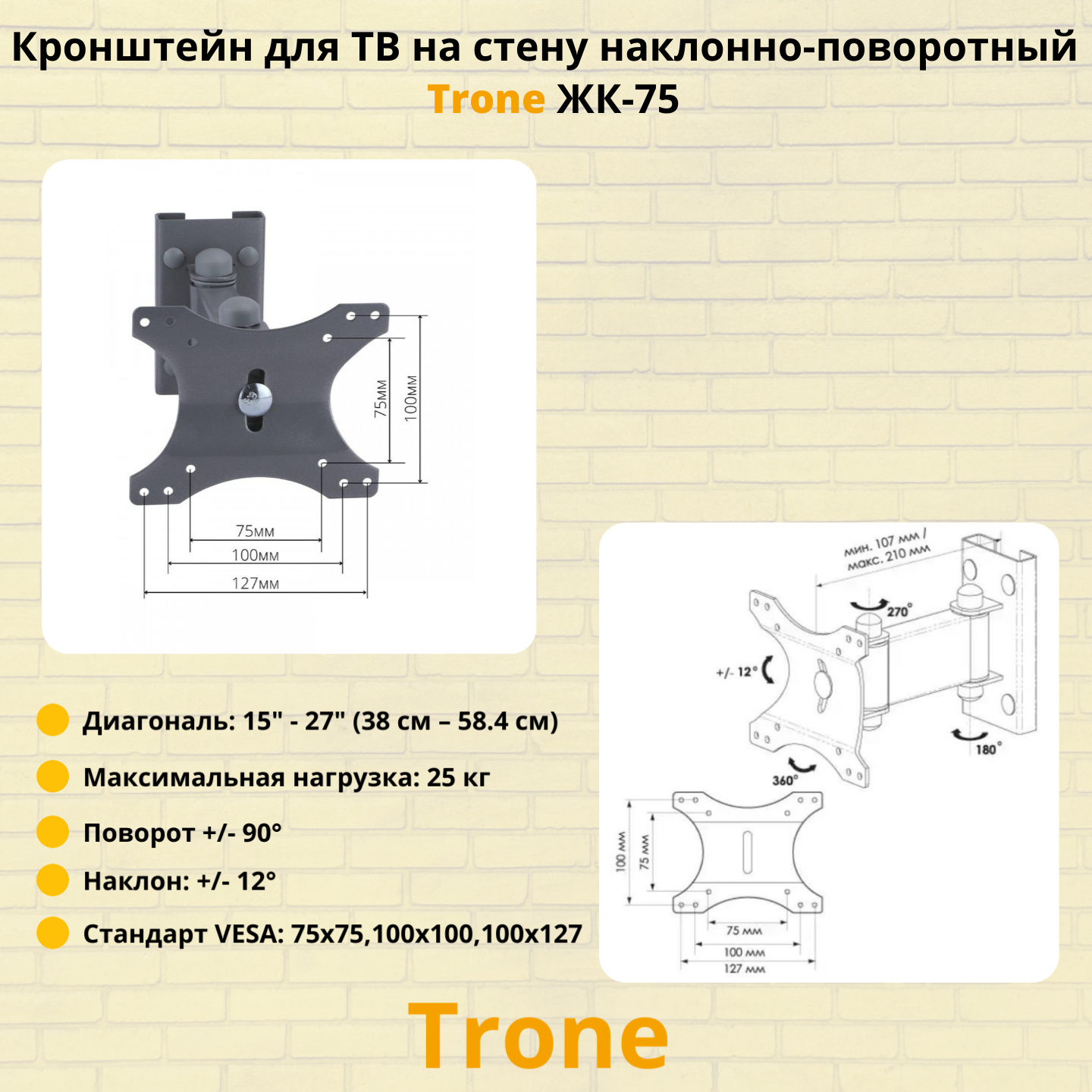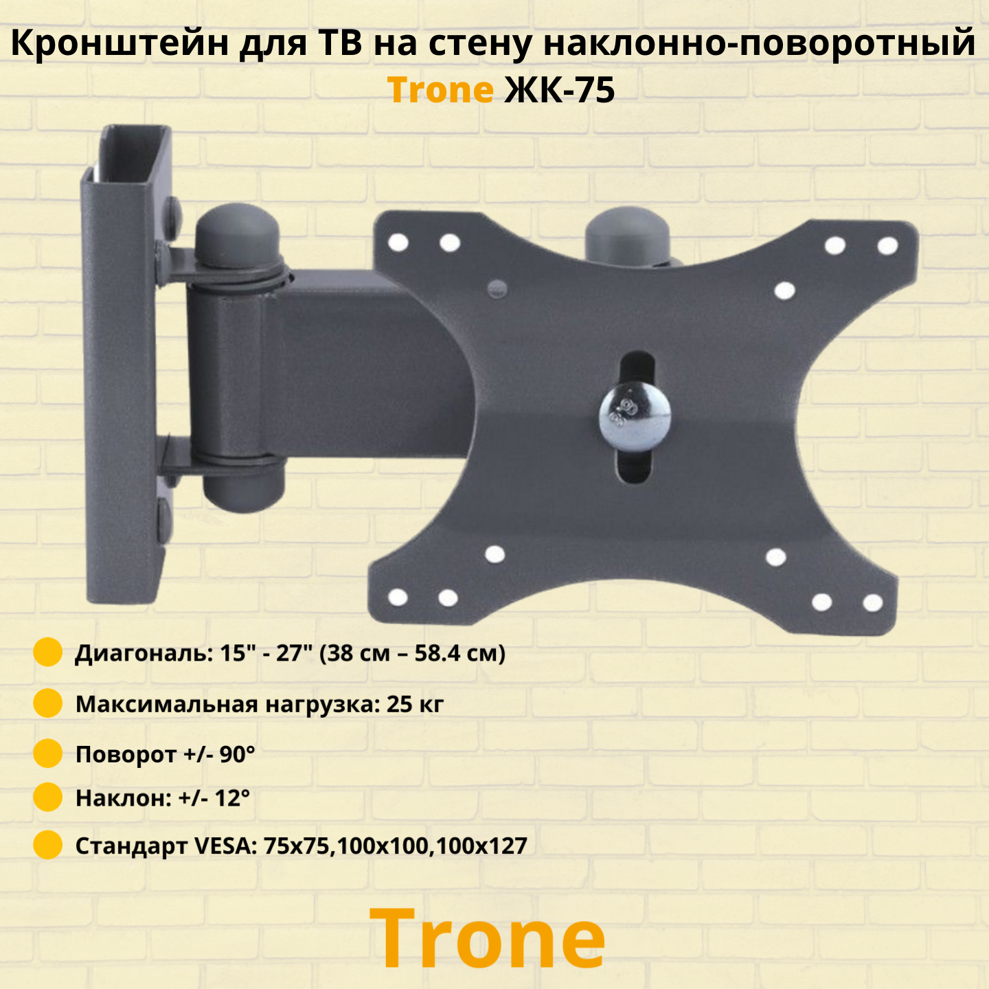 Кронштейн для телевизора на стену наклонно-поворотный с диагональю 15"-27" Trone ЖК-75,черный