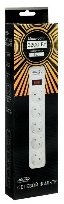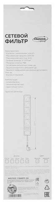 Сетевой фильтр Luazon Lighting, 5 розеток, 5 м, 2200 Вт, 3 х 0.75 мм2, 10 А, 220 В, белый информация: