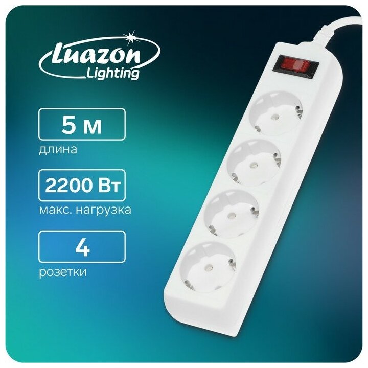 Luazon Lighting Сетевой фильтр Luazon Lighting, 4 розетки, 5 м, 2200 Вт, 3 х 0.75 мм2, 10 А, 220 В, белый