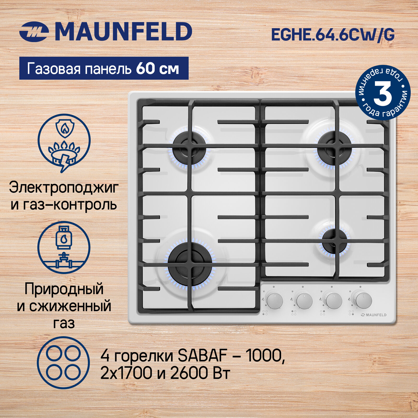 Газовая варочная панель MAUNFELD EGHE.64.6CW/G информация: