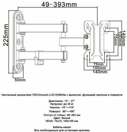 Настенный кронштейн iTECHmount LCD123 White с выносом, функцией наклона и поворота информация: