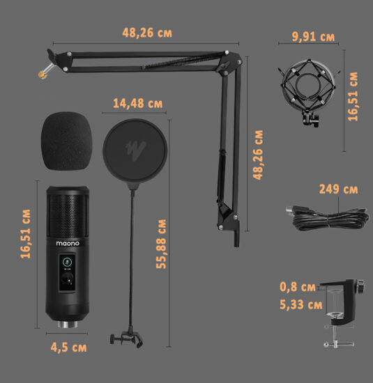 Maono AU-PM421 USB-микрофон, конденсаторный кардиоидный. Пантограф, держатель, поп-фильтр, ветрозащи 5 100 ₽