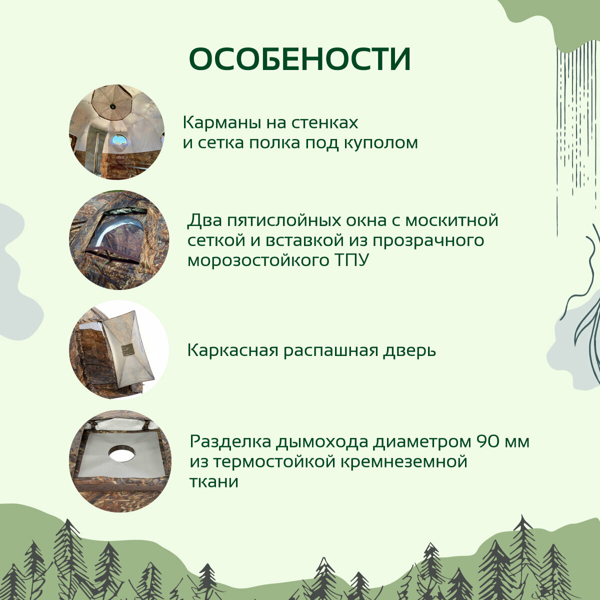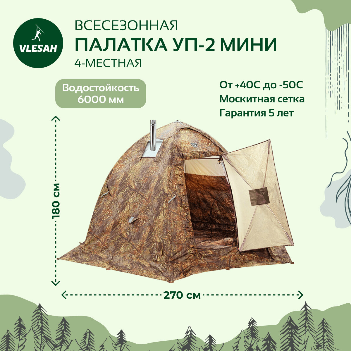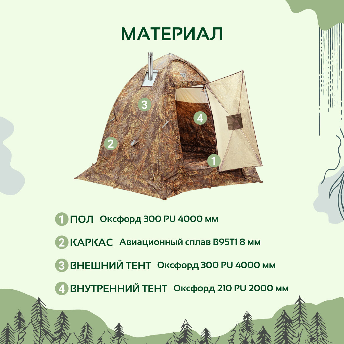 | Дополнительная информация | стенка внутри палатки (в месте установки печи) дополнительно оборудована съемной термостойкой тканью, способной выдерживать температуру до 1200 градусов |