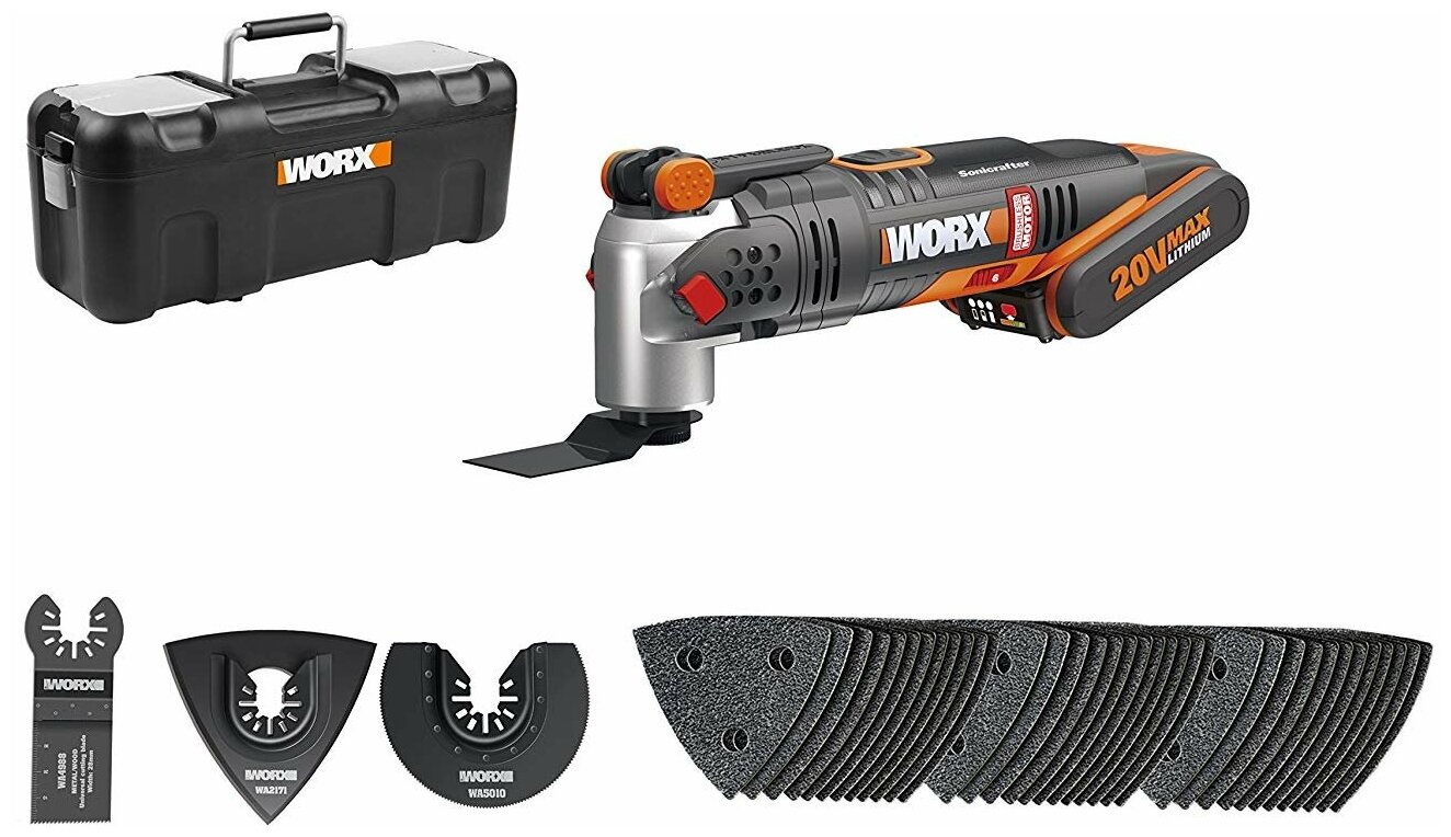 | Комплектация | реноватор, аккумулятор, зарядное устройство WA3880, набор аксессуаров (39 шт.), бокс |