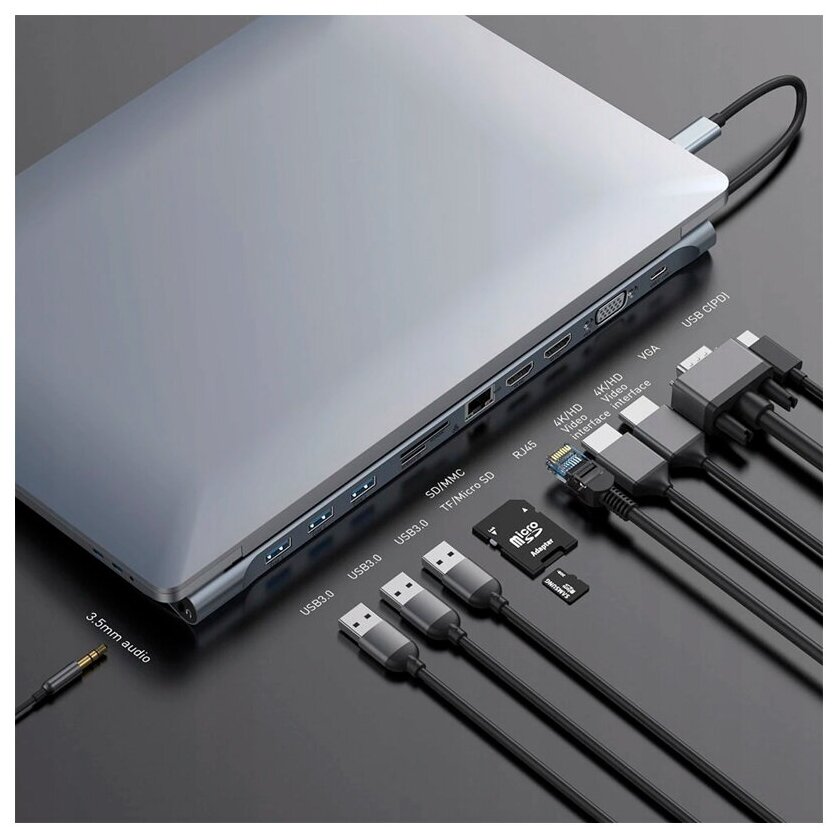 USB HUB разветвитель BASEUS Enjoyment Series 11 в 1 Type-C (m) - 3xUSB3.0 + Type-C PD + 2xHDMI + RJ45 + VGA + 3.5мм + SD/TF, темно-серый