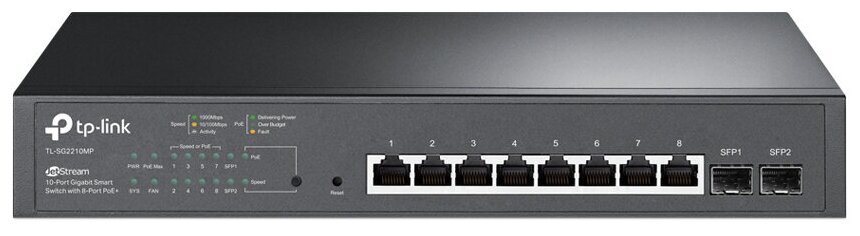 TP-Link TL-SG2210MP JetStream™ 10-портовый гигабитный Smart коммутатор с 8 портами PoE+, 2 гигабитных SFP-слота, 802.3at/af, бюджет PoE — 150 Вт, стальной корпус 1U 13" 18 403 ₽